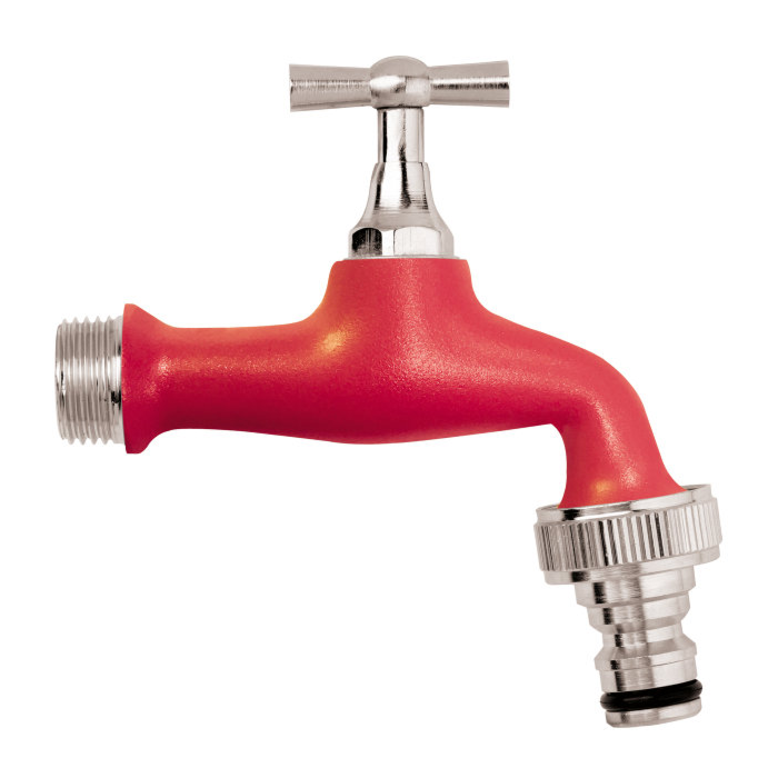 De rode Colortap buitenkraan met 1/2'' buitendraad en kraanaansluiting, die een standaard aansluiting heeft voor snelkoppelingen naar 1/2" of 3/4" slangen, biedt gemakkelijke aansluiting voor het besproeien van de tuin of het wassen van de auto. Uitgerust met een rode anti-kras polyester verflaag, is de kraan geschikt voor een werkdruk tot 10 bar.