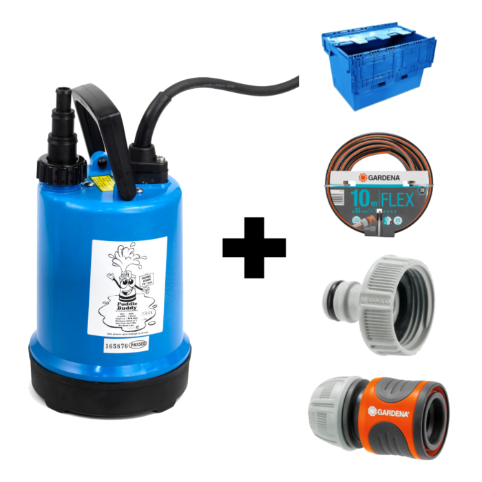 De Puddle Buddy Set is een complete bundel voor wie snel en efficiënt water wil wegpompen, zónder losse onderdelen bij elkaar te moeten zoeken. Bij pvcvoordeel.nl vind je deze set als praktische totaaloplossing: een Puddle Buddy vlakzuigende dompelpomp gecombineerd met slimme Gardena accessoires en een stevige opbergbox. Ideaal voor het leegpompen van kelders, garages, kruipruimtes, putten en bakken. Dankzij de vlakzuigende werking start de pomp al bij ca. 3 mm water en pompt door tot ca. 1 mm restwater — perfect als je een ruimte zo droog mogelijk wilt achterlaten.